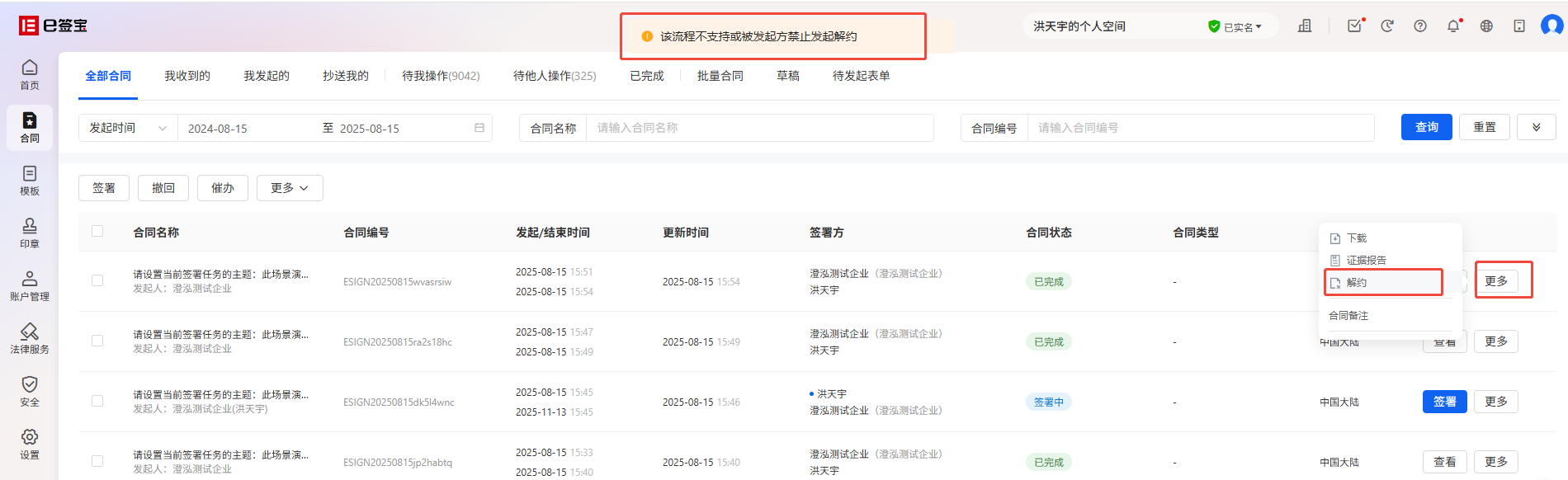- e签宝后台仍会展示解约按钮,但点击按钮会出现报错【该流程不支持或被发起方禁止发起解约】;