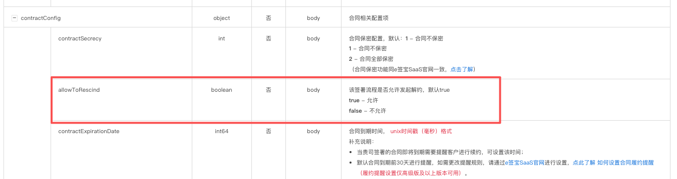 - allowToRescind 该签署流程是否允许发起解约,默认true。true - 允许,false - 不允许