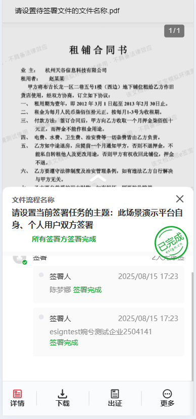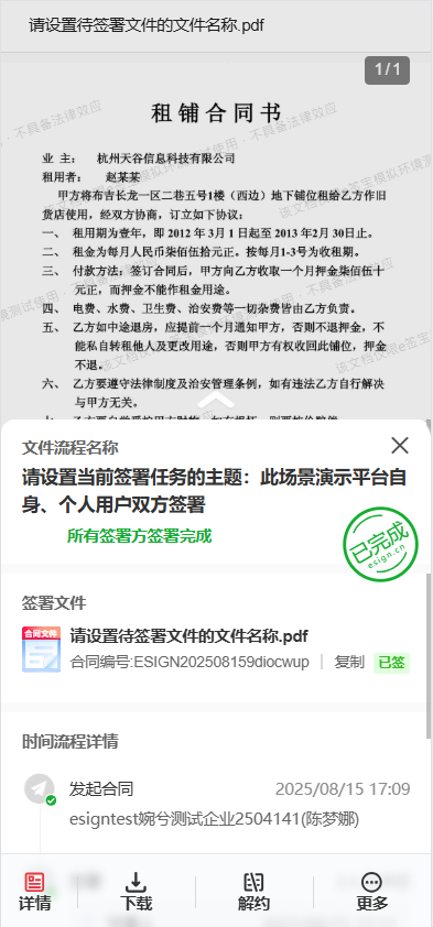 解约用于对已签署完成的合同进行作废处理。默认情况下,完结的签署流程可通过调用解约接口(点击了解 接口发起合同解约服务)、用户签署完成页面的解约按钮(见下文效果展示)以及e签宝官网(点击了解 官网如何进行合同解约)发起解约。