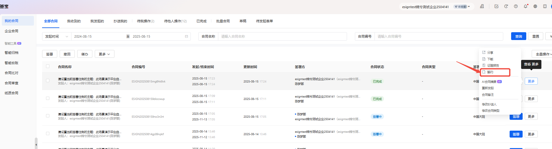 屏蔽解约入口前:e签宝解约接口、用户签署页面、e签宝官网后台均能正常发起解约;