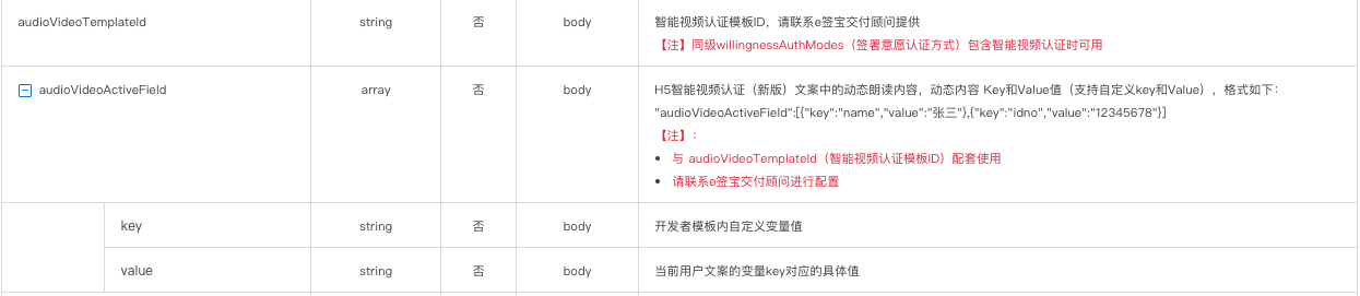 - audioVideoActiveField 智能视频认证文案中的动态朗读内容,动态内容 Key:Value值(支持自定义key和Value)