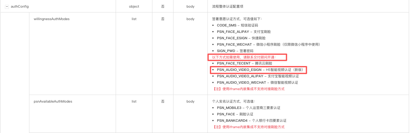 - willingnessAuthModes 签署意愿认证方式,指定:PSN_AUDIO_VIDEO_ESIGN - H5智能视频认证(新版)