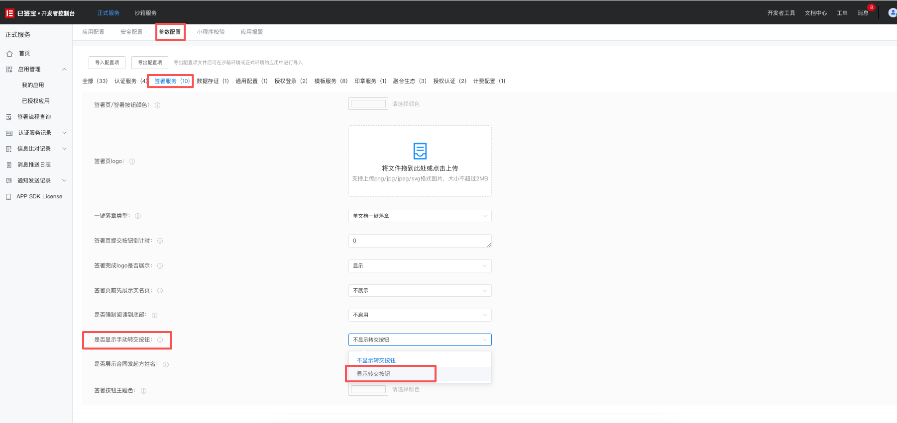 3.点击页面的【参数配置】-【签署服务】,找到【是否显示手动转交按钮】选择“显示转交按钮”,即可在签署页面内展示“转交”按钮。