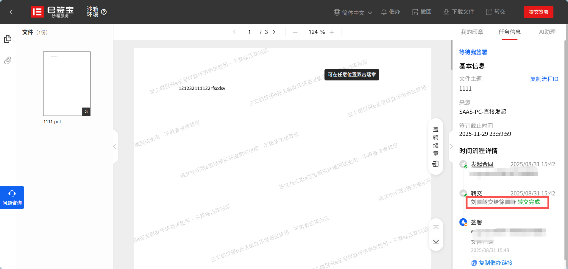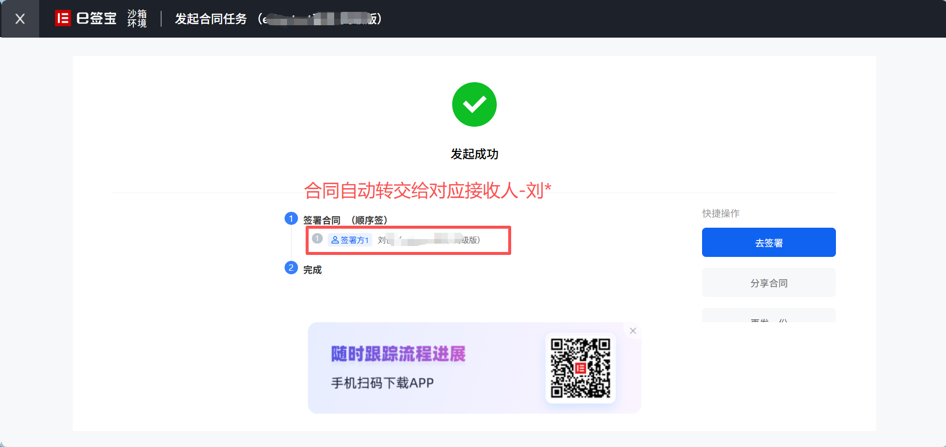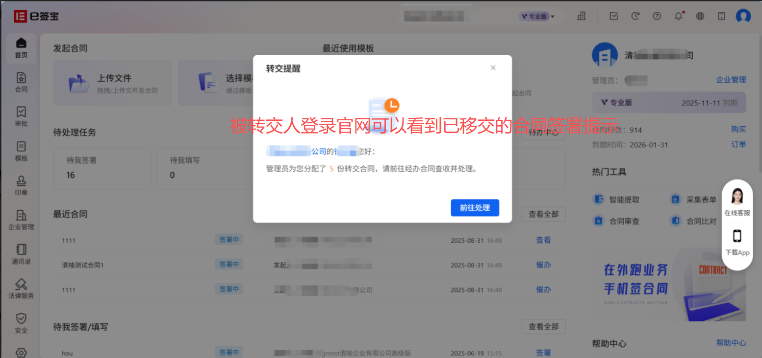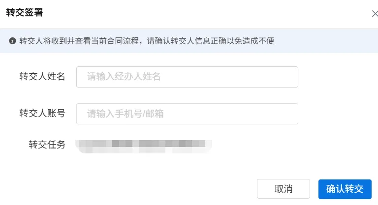 - 转交后原签署人不再参与该合同签署环节