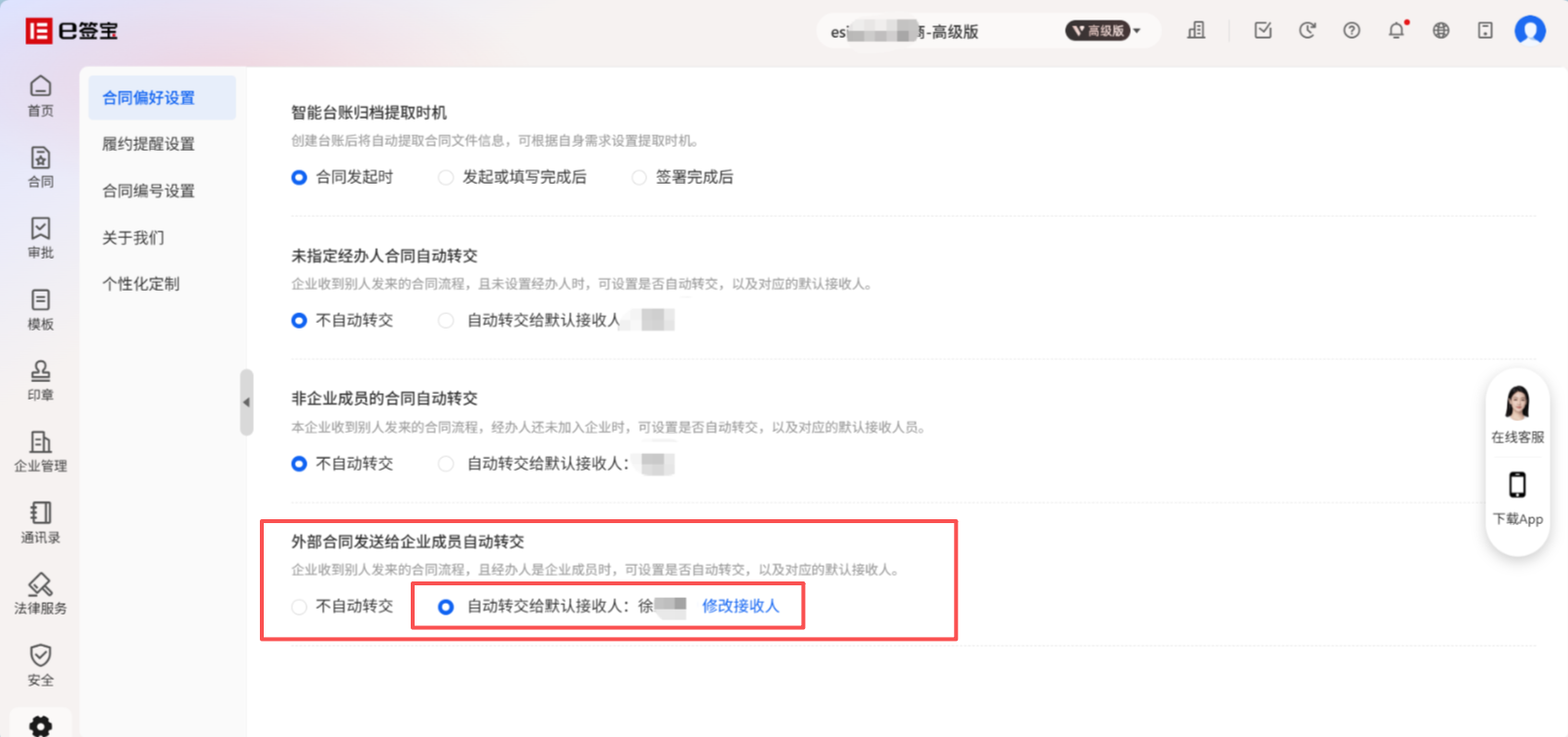 3、合同偏好设置里面选择第三个:“外部合同发送给企业成员自动转交”对应的效果图