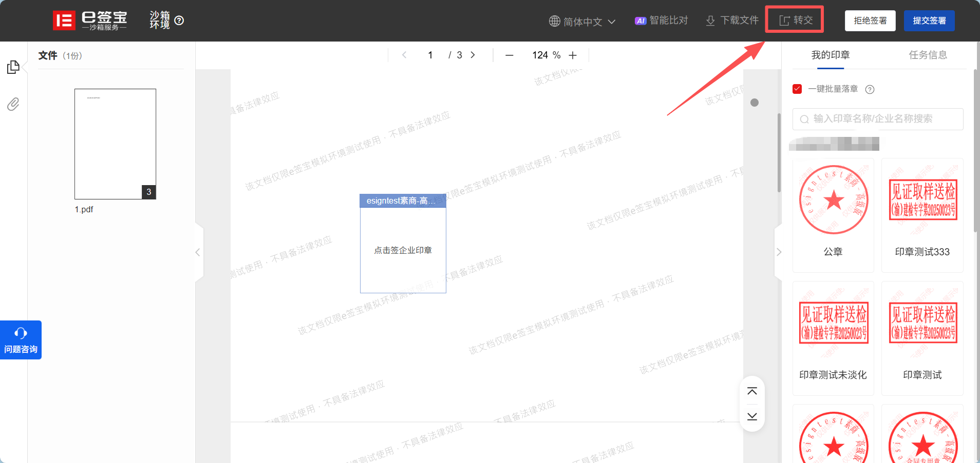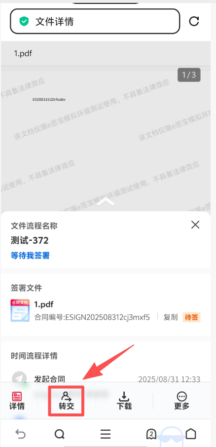 1、发起转交:原签署人在收到合同后,通过转交功能将合同转给代签人