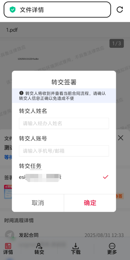 需要当前签署方输入要转交人的姓名和账号: