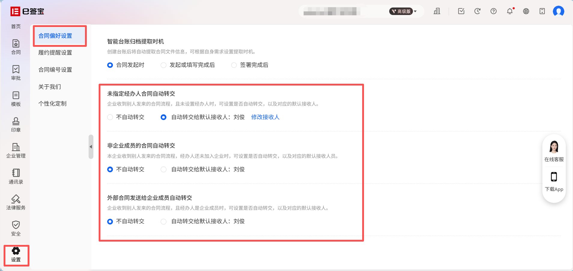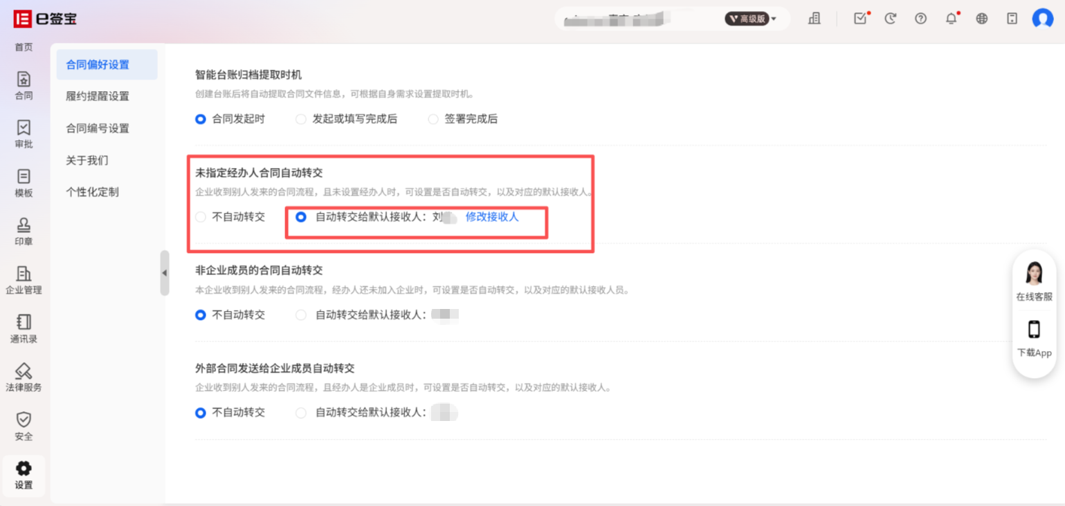 进入e签宝官网的自身企业空间下:【合同偏好设置】中搜索“转交”,有三个不同情形可以针对自身需求设置,设置完成之后,合同发起符合对应情形时,会自动转交给偏好里面设置的合同接收人。