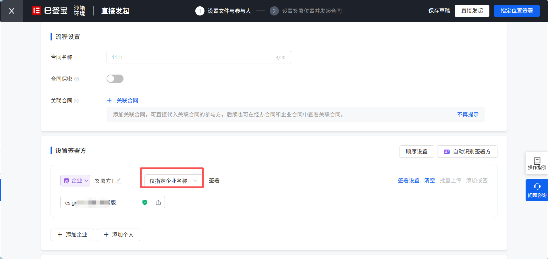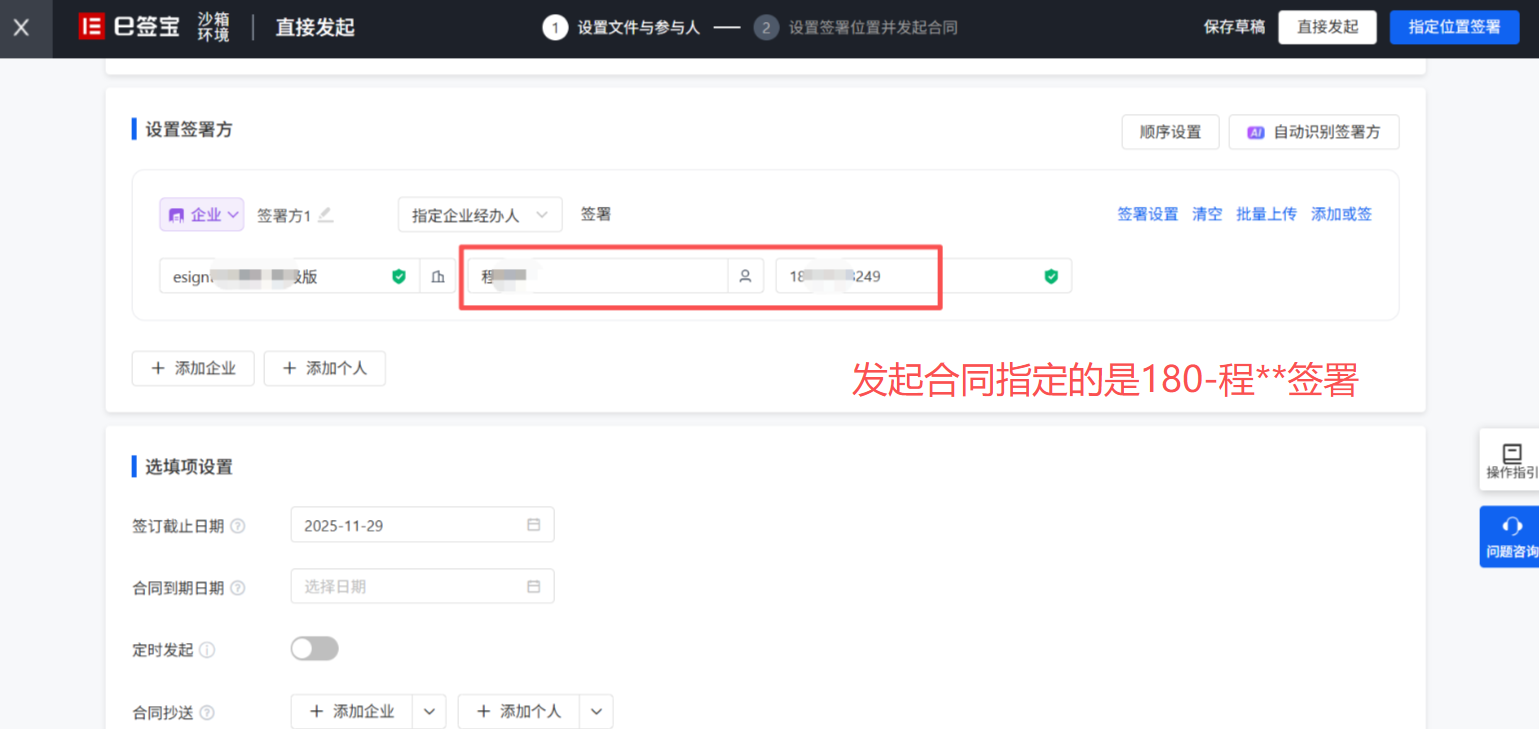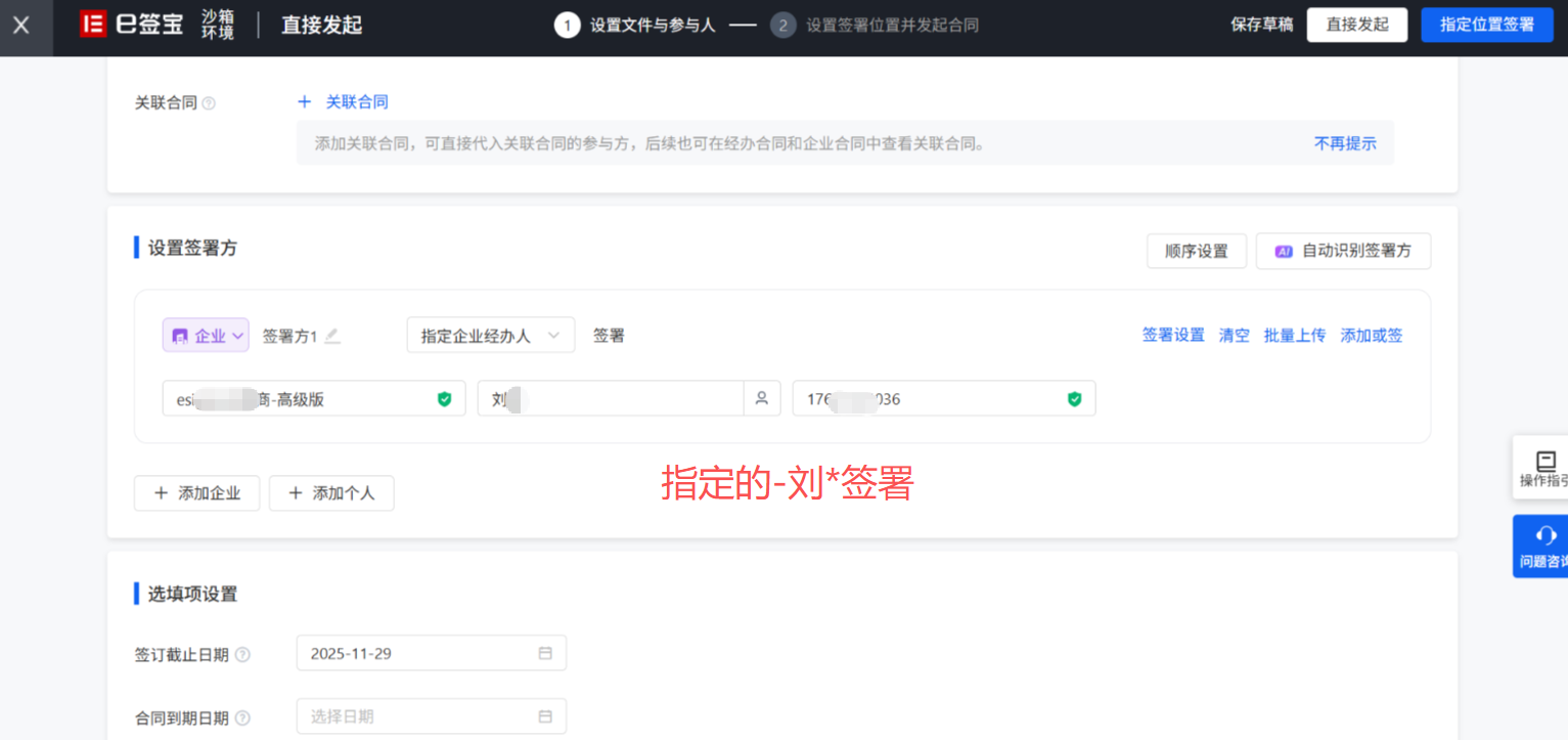 注意:这里如果是接口发起的签署,默认企业经办人是必须指定的,如需不指定,请联系e签宝技术人员配置后才可使用。