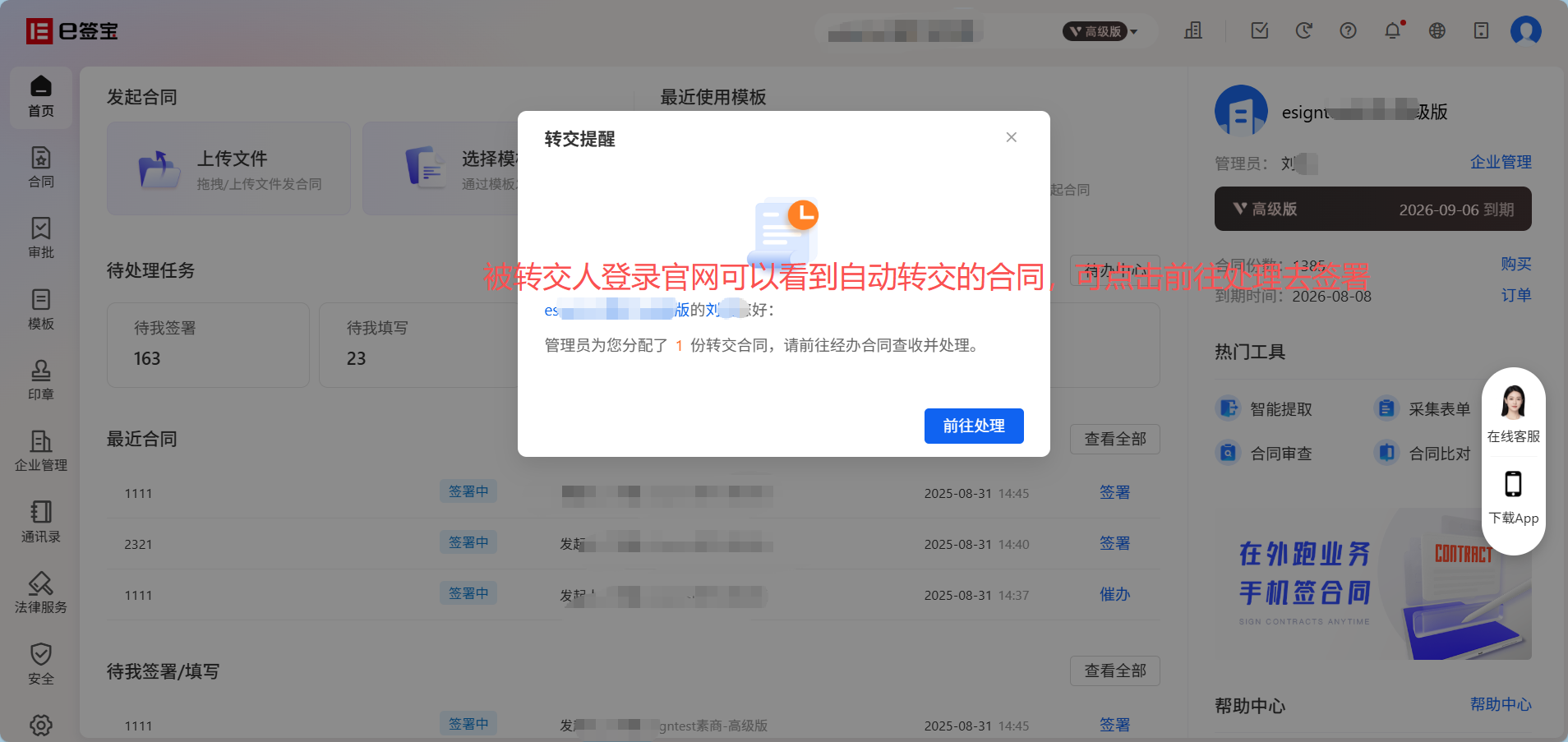 除上述个人在签署页面手动转交功能之外,e签宝官网的企业管理中也支持针对自身企业的经办人设置自动转交。