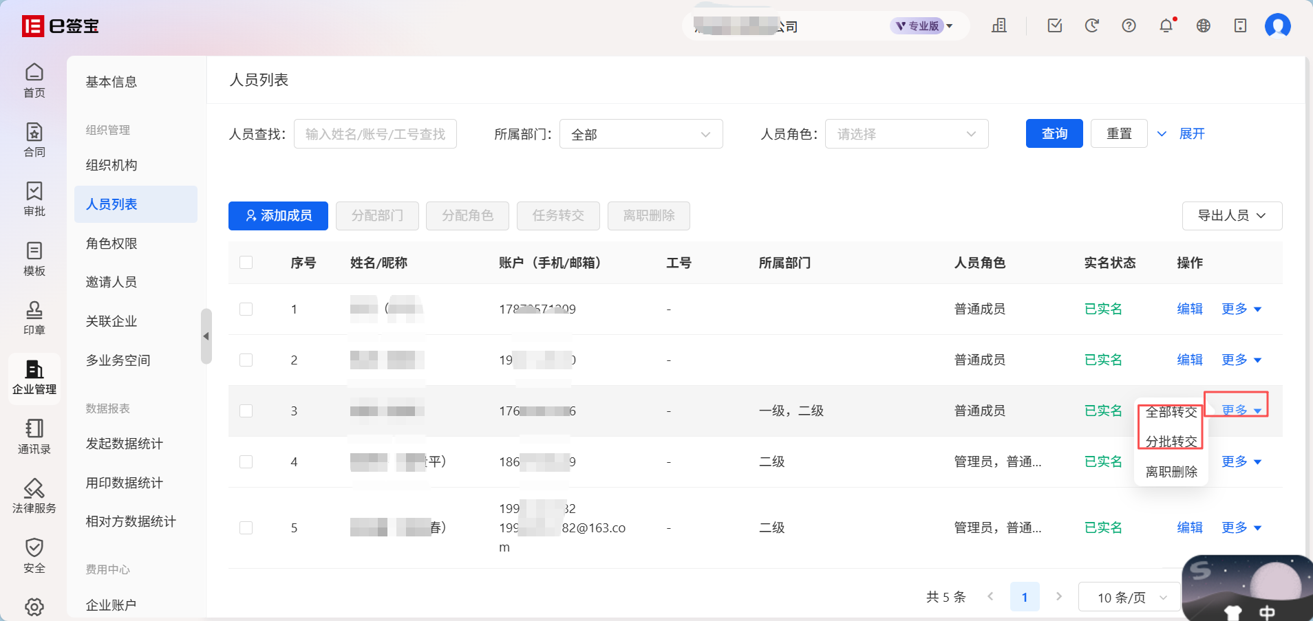 进入e签宝官网的自身企业空间下:【企业管理】-【人员列表】中找到对应的离职人员,点击【更多】可以选择【全部转交】或【分批转交】。