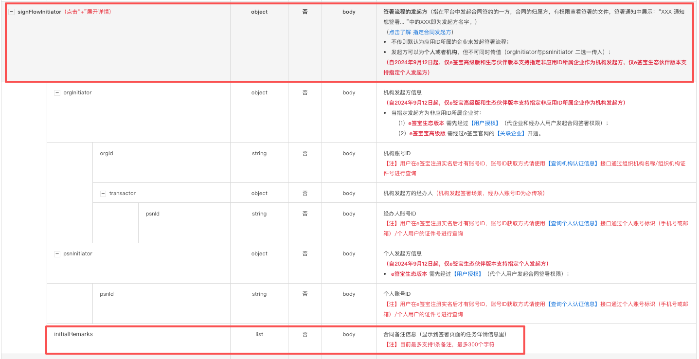 此接口用来发起签署,发起成功后会返回签署流程标识:signFlowId。 | 必需 | |