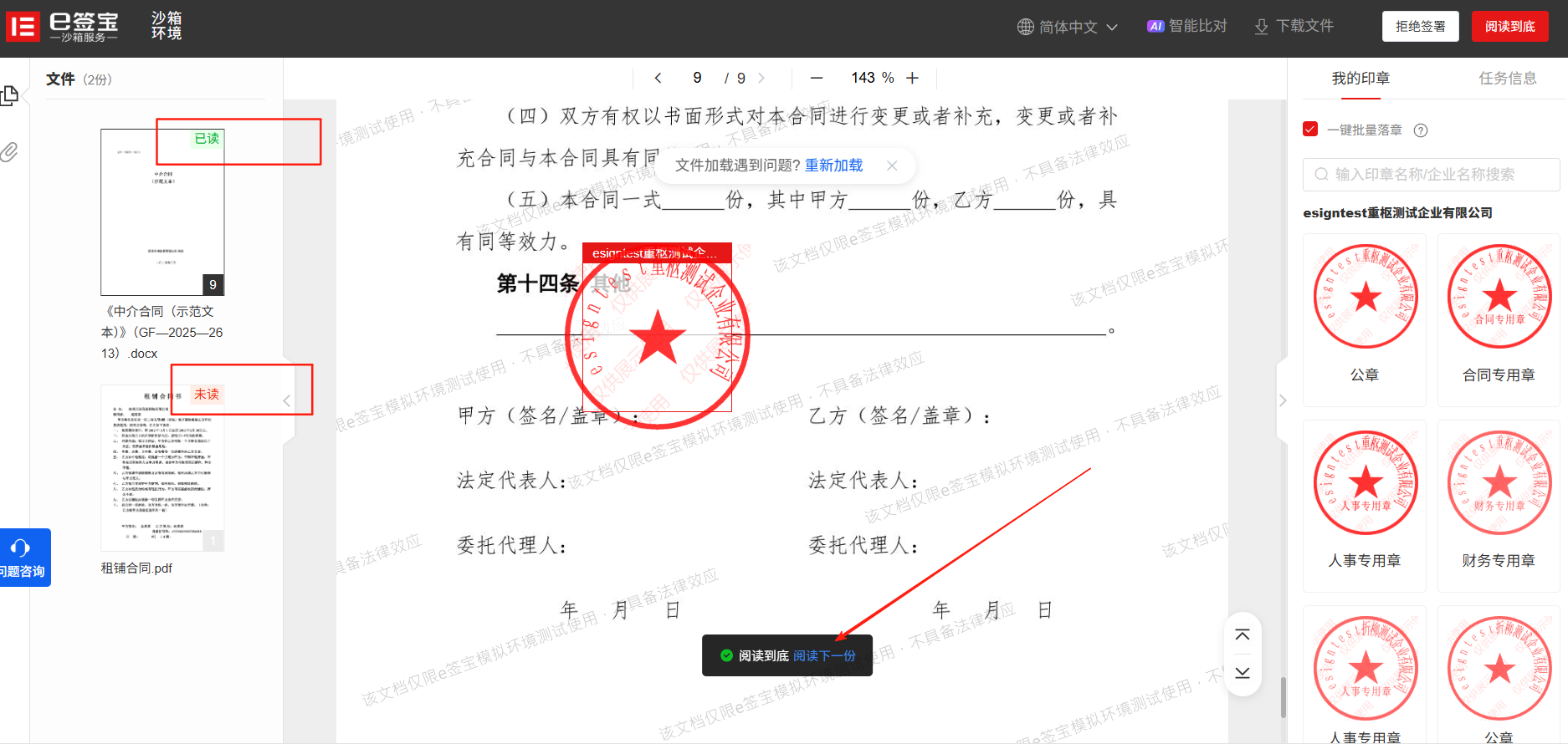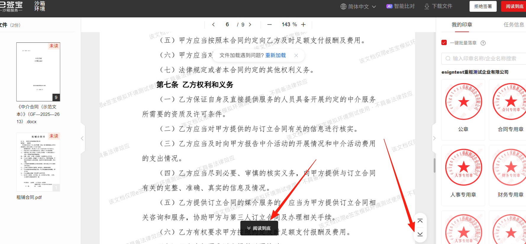 进入签署页面,会提示进行“阅读到底”,否则无法提交签署,可通过页面中的箭头按钮快速到达文件底部。