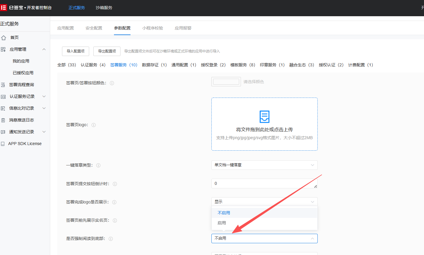 3.点击页面的【参数配置】-【签署服务】,找到【是否强制阅读到底部】从【不启用】改成【启用】。