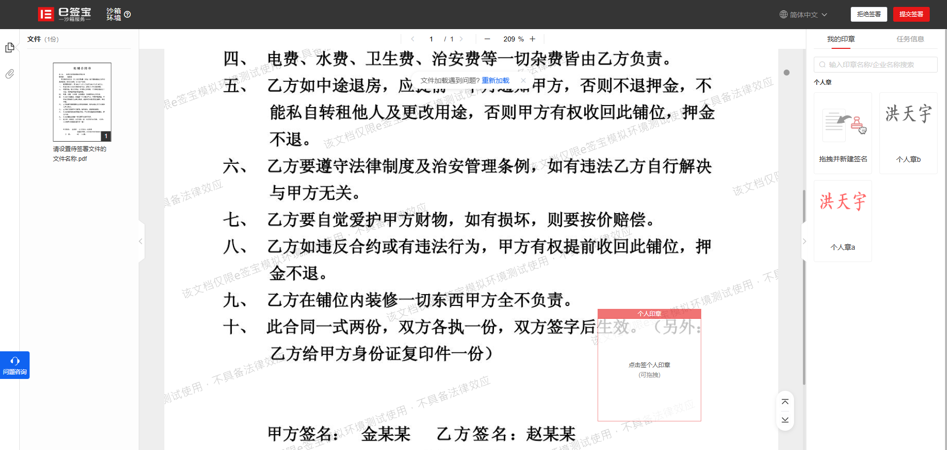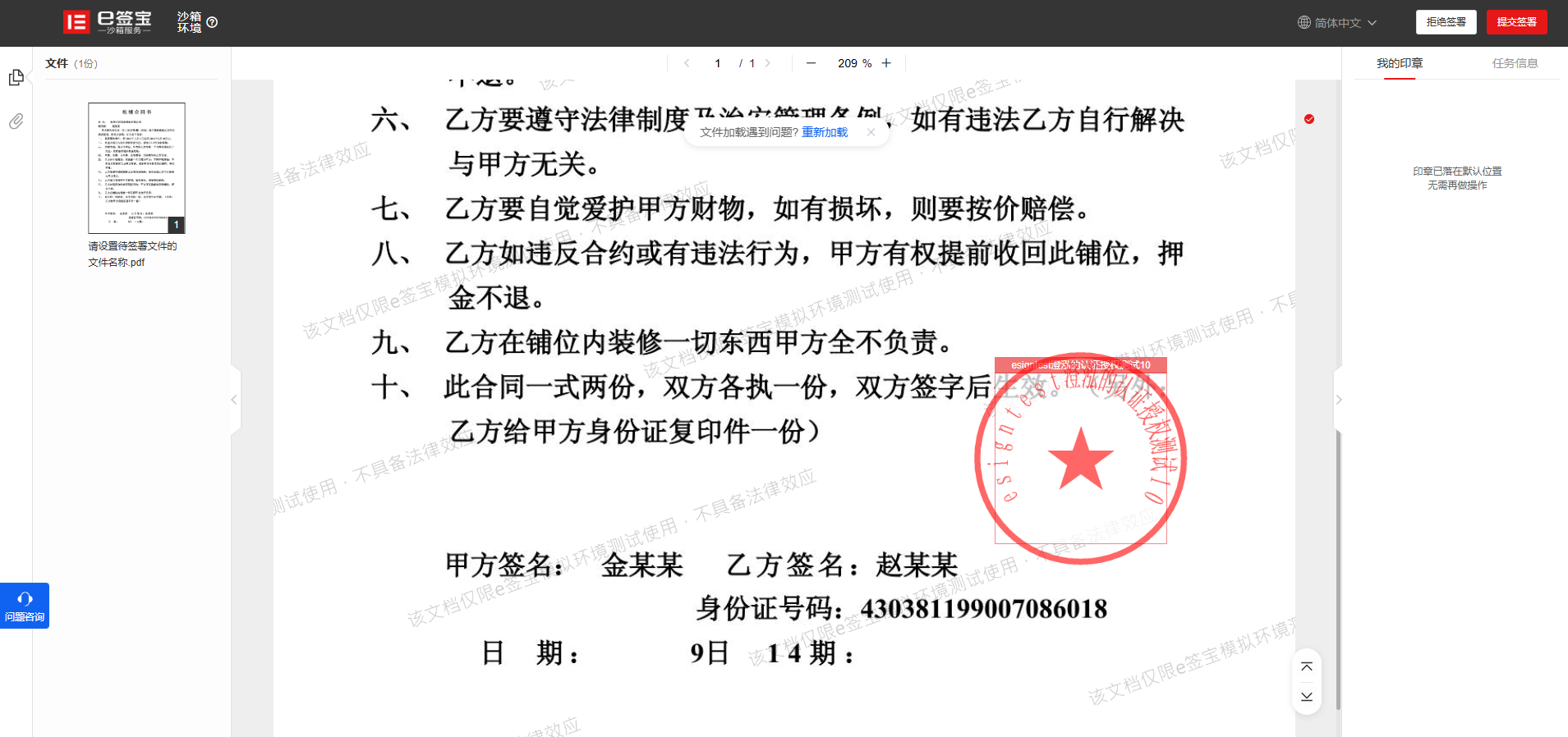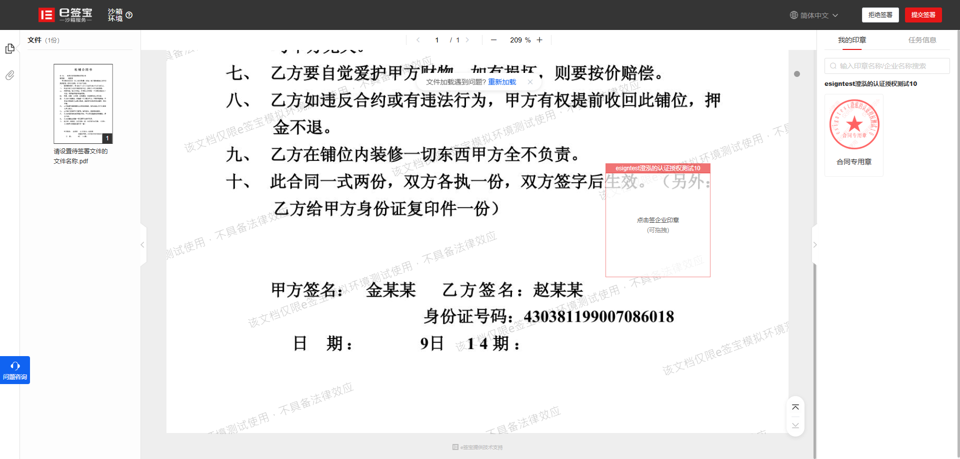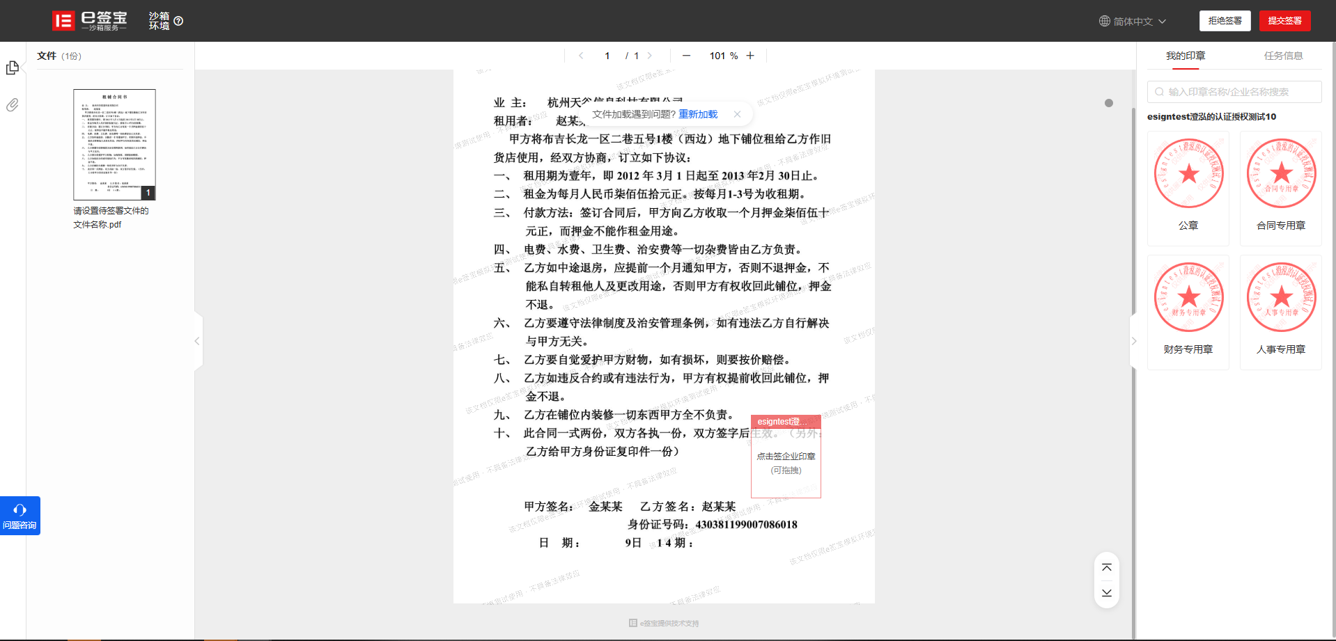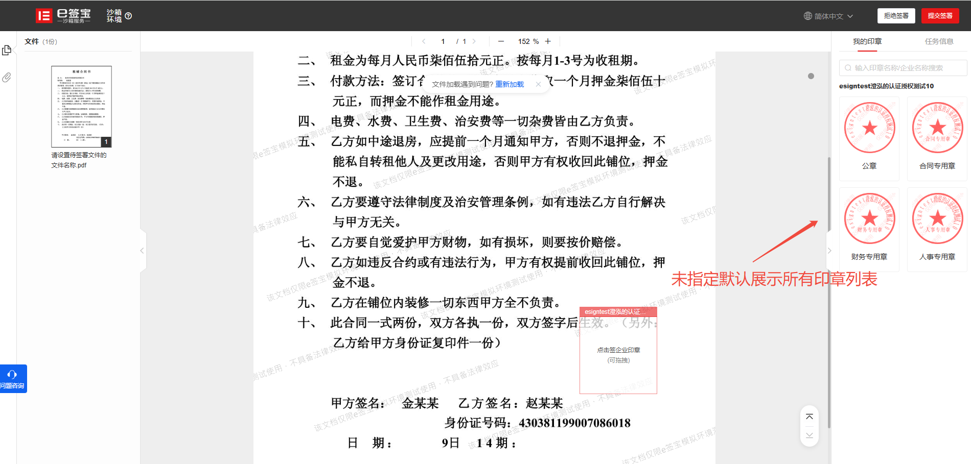 指定assignedSealId后,进入签署页面,印章自动会落到企业签署区中,无需经办人手动拖拽: