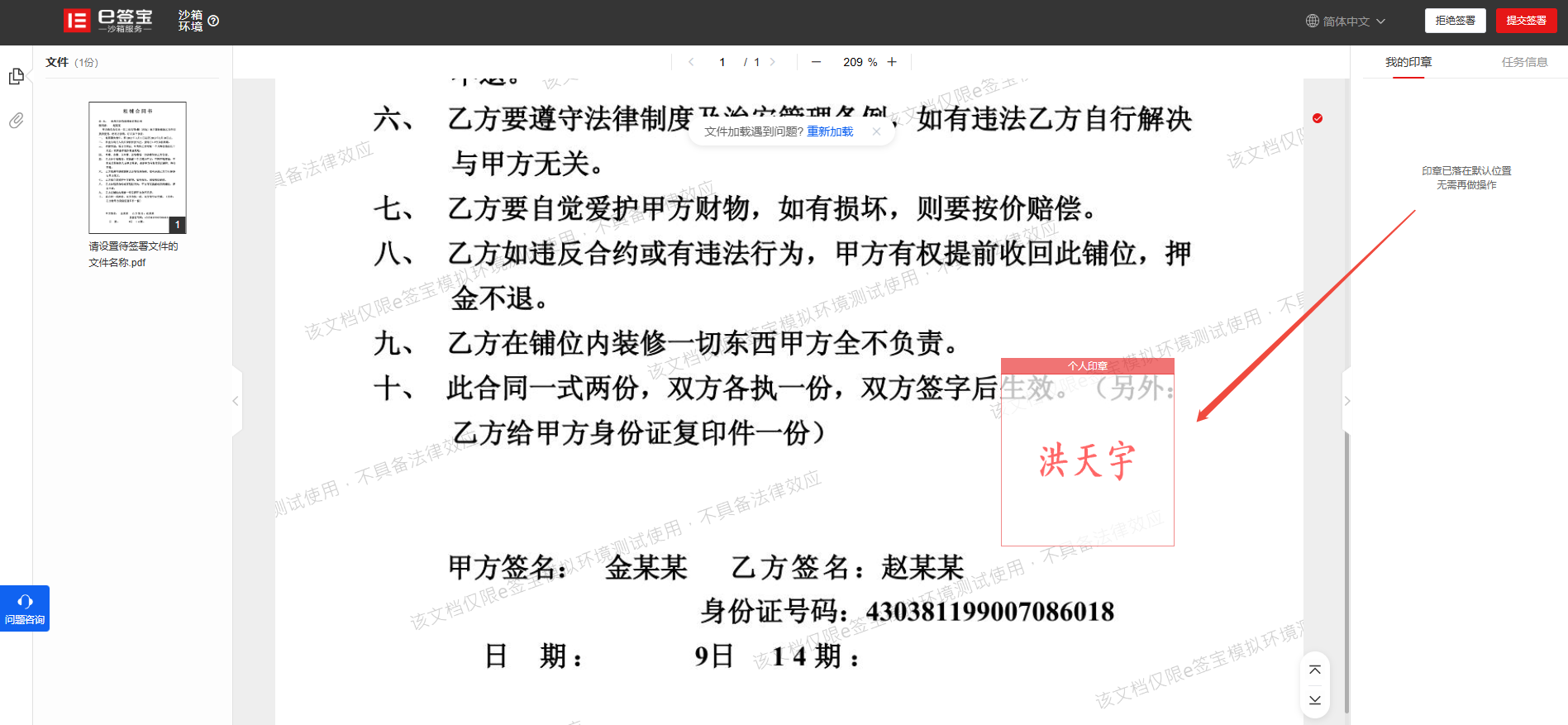 指定assignedSealId后,进入签署页面,印章自动会落到个人签署区中,无需人工手动拖拽。