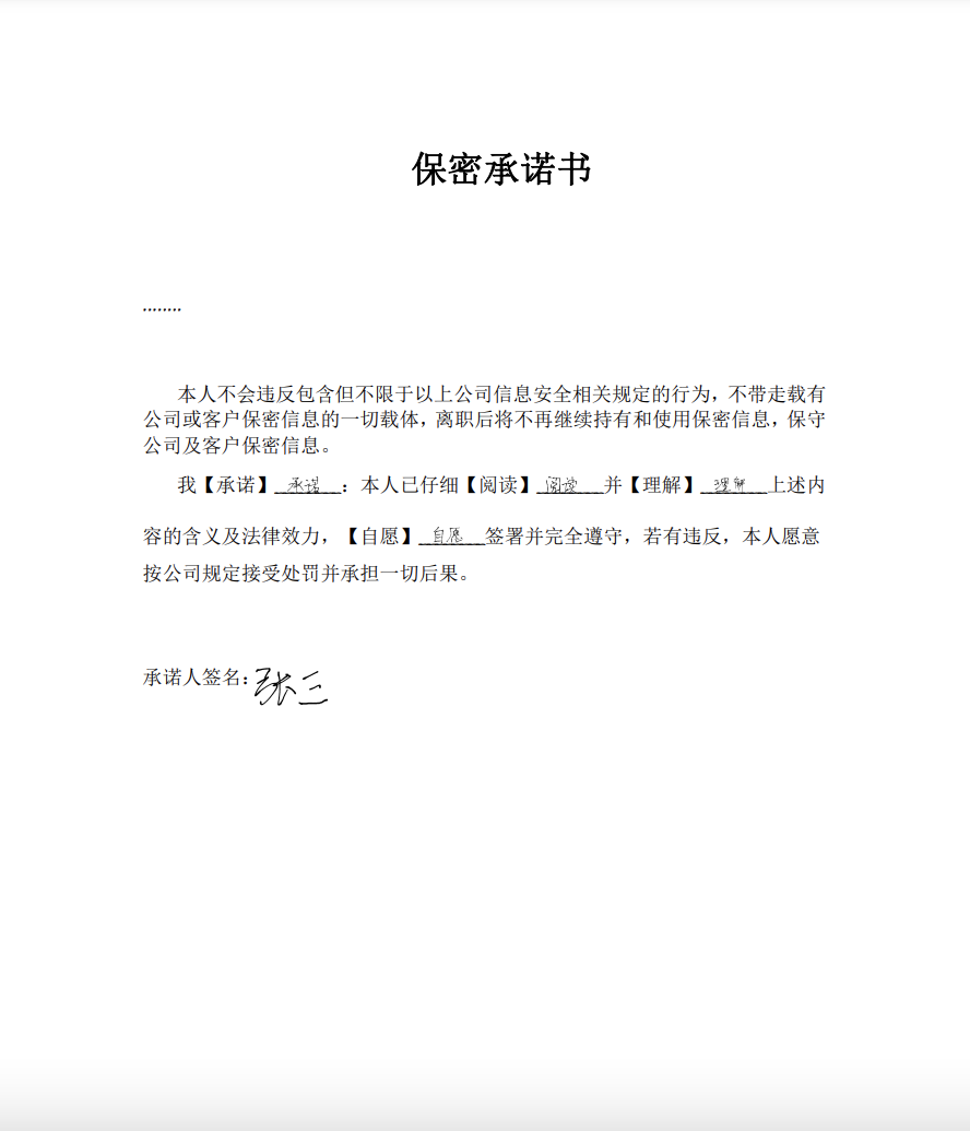 其中【承诺】、【阅读】等字样为用户在备注区手写抄录的文字;承诺人签名:“张三”为用户在签章区手写的签名。