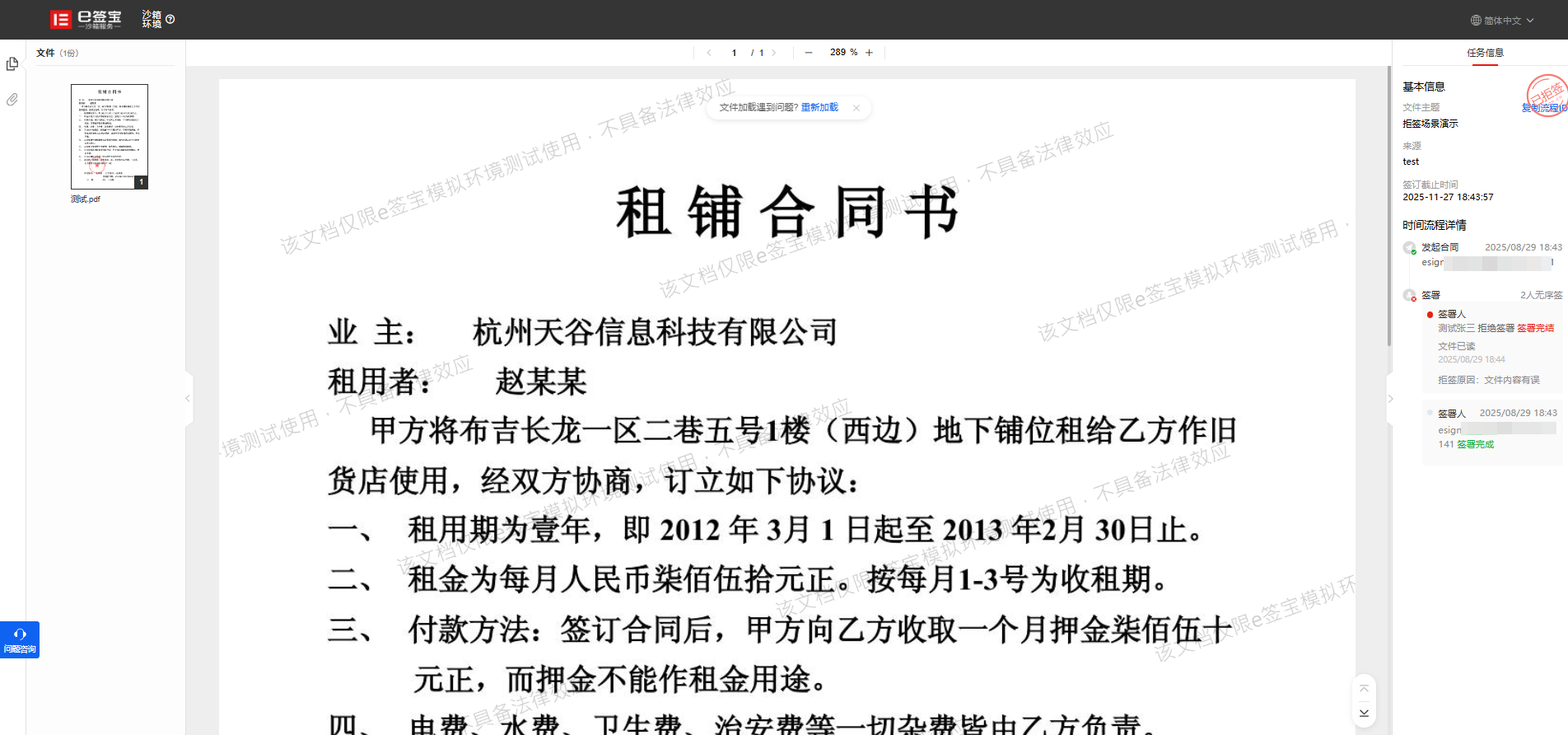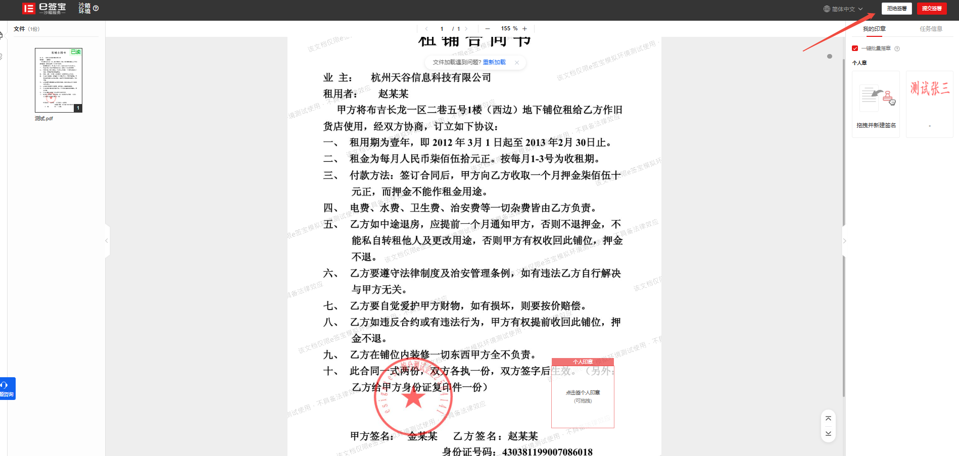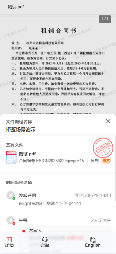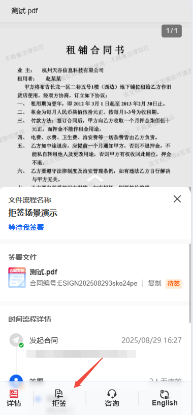 签署方在查看签署页时,如发现信息有误或对合同内容有异议,可主动点击“拒签”按钮拒绝签署,该操作将直接终止当前签署流程。
