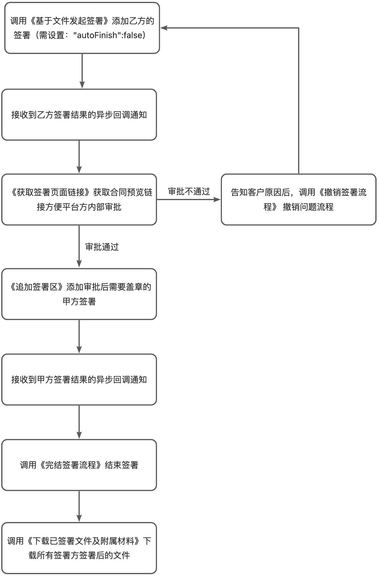 注:请在确认所有签署方均完成签署后,再调用《完结签署流程》接口。建议通过《签署结果回调通知》或《主动查询签署状态》的方式进行确认,避免因系统处理延迟导致接口报错“签署区没有全部完成”。