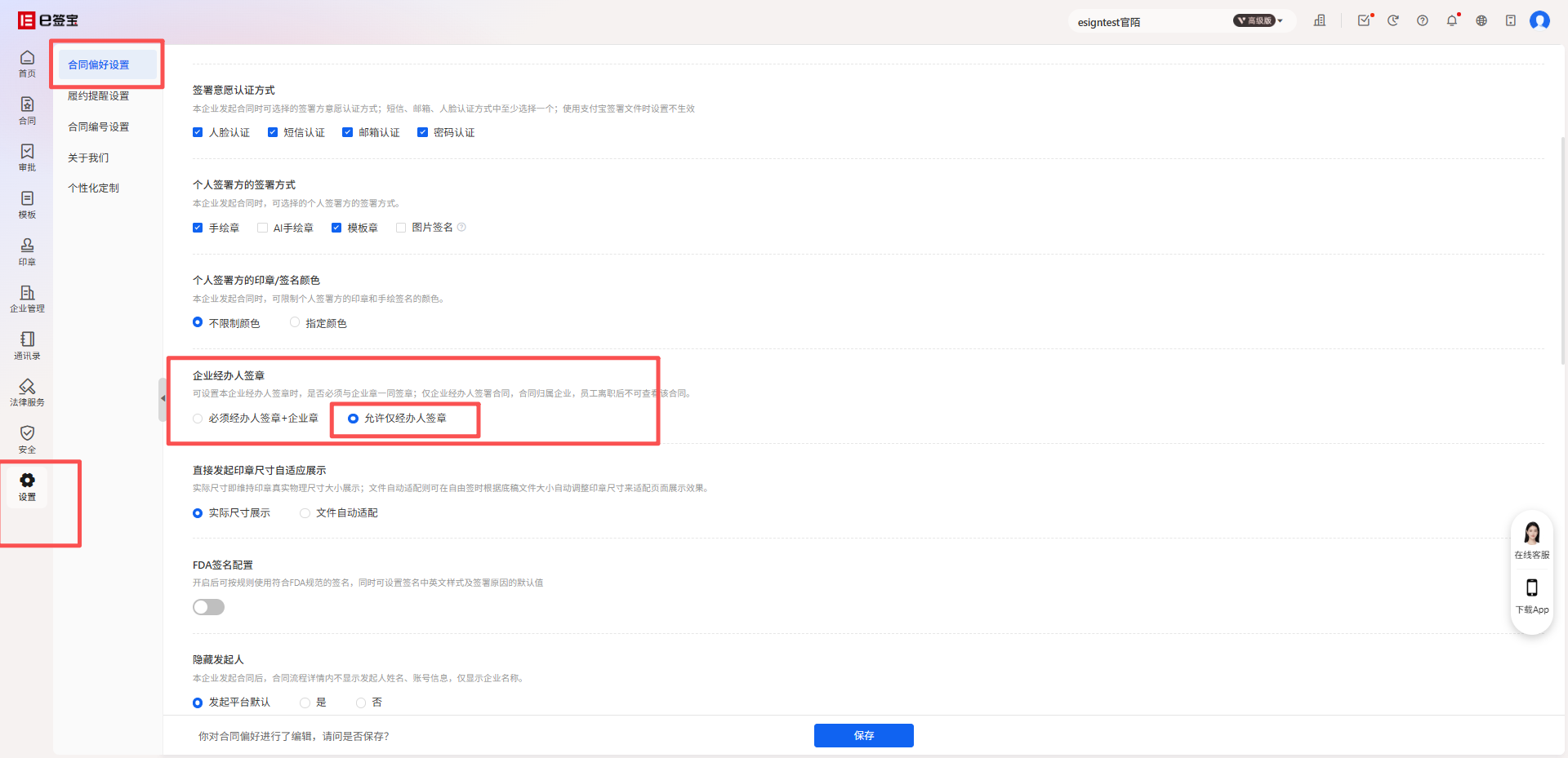 进入e签宝官网的自身企业空间下:【合同偏好设置】中设置【企业经办人盖章】选择:“允许仅经办人盖章”。