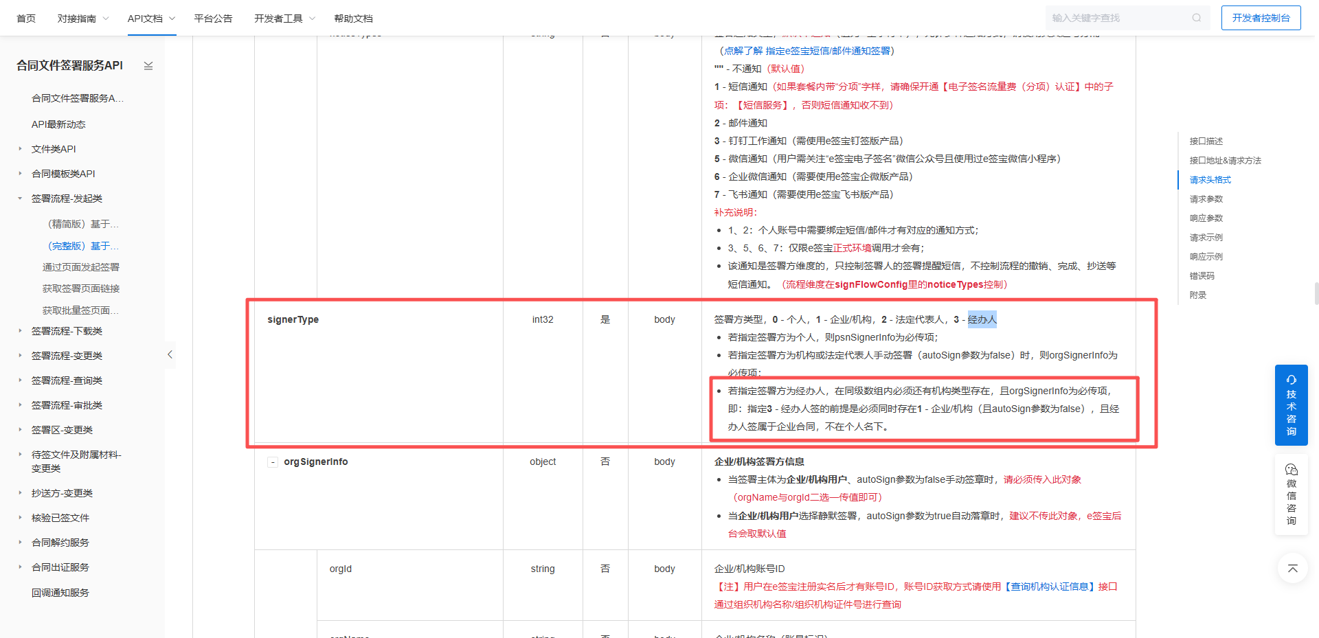 - signerType (签署方类型)一个签署方设置为:1(机构),另一个签署方设置为:3 (经办人)