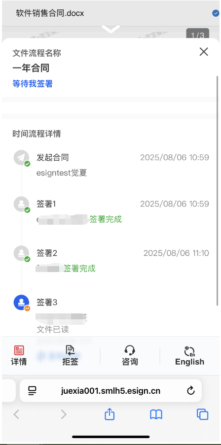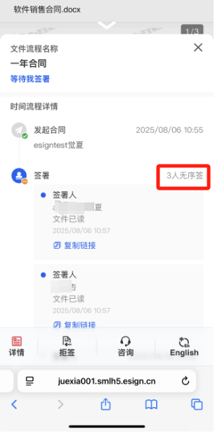 指定签署顺序的情况下,签署详情页面会展示具体的签署方顺序,需要上一个签署方签署完成后,下一个签署方才会收到签署通知,这时才可以操作签署。