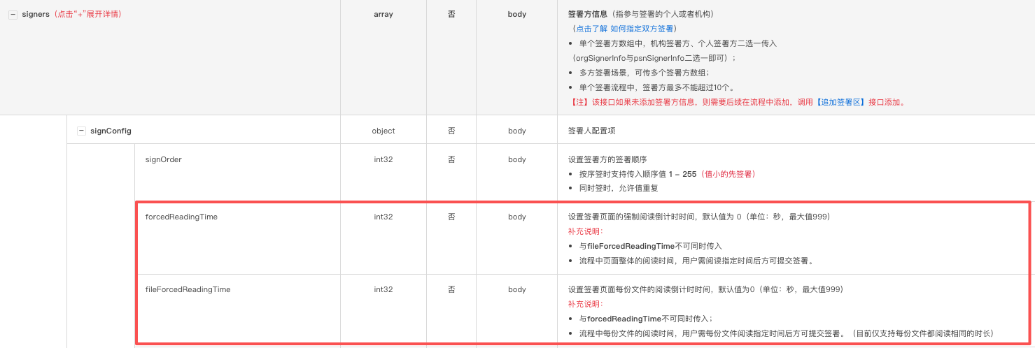 - forcedReadingTime 设置签署页面的强制阅读倒计时时间,默认值为 0(单位:秒,最大值999)
