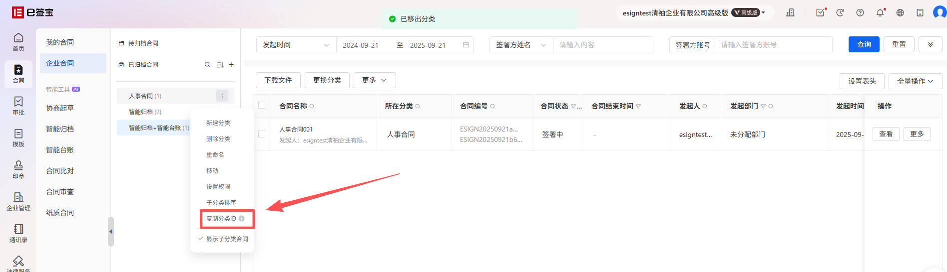 1.登录e签宝SaaS官网-企业空间首页-合同管理-企业合同-已归档合同中新建分类-详情中复制分类ID