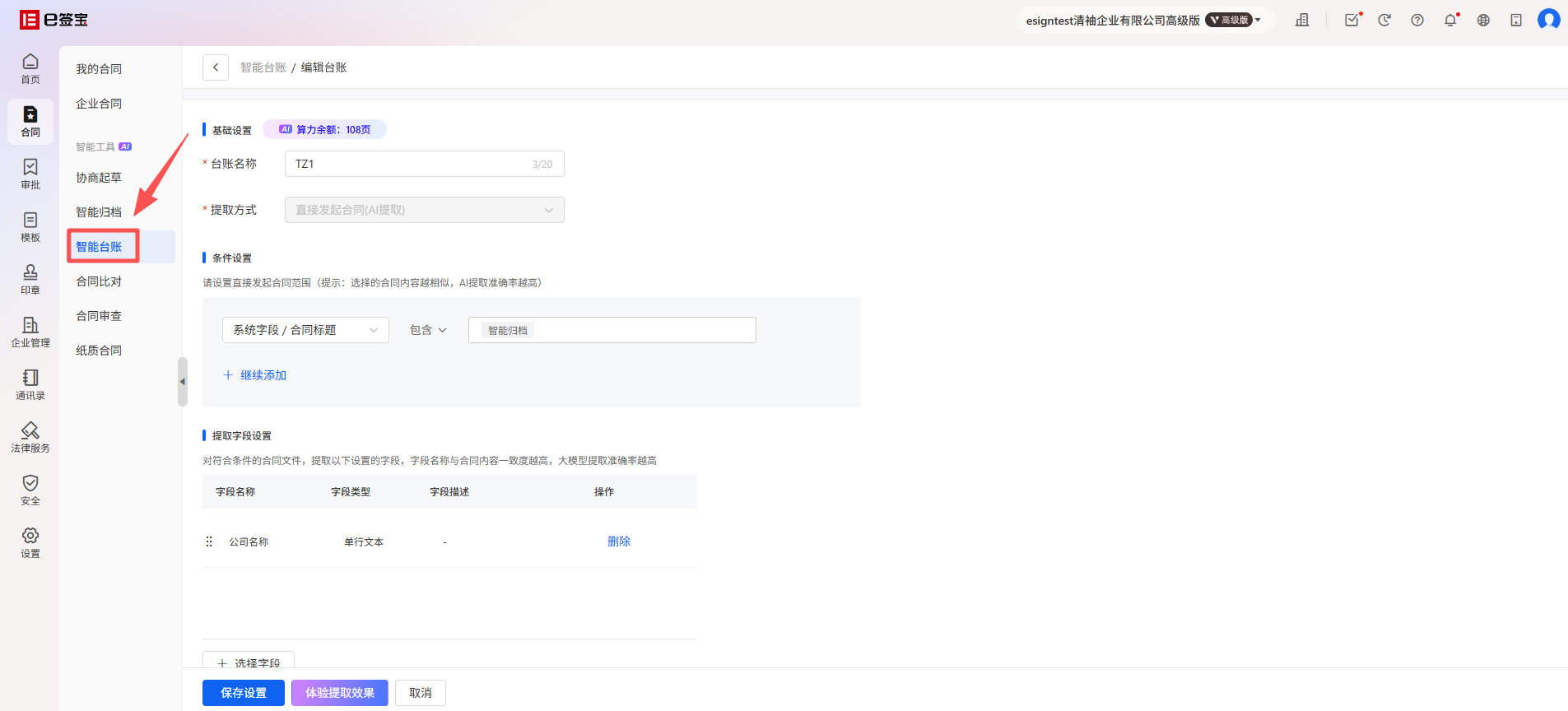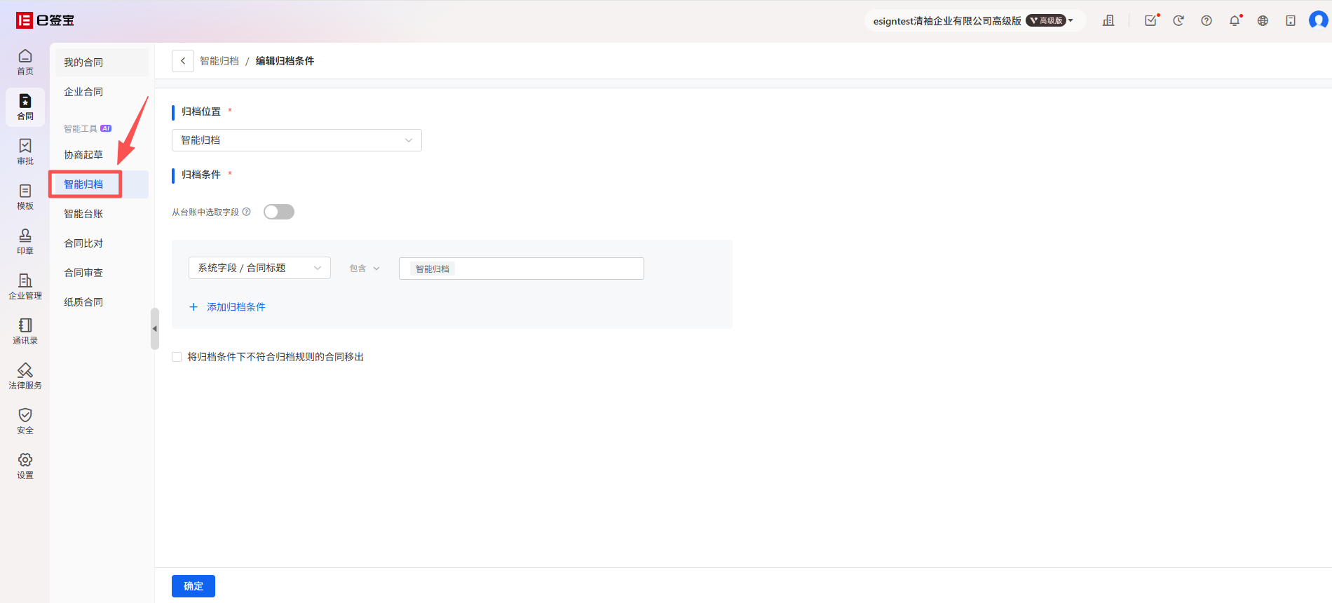 登录e签宝SaaS官网-智能归档选择合同需要自动归档的位置和归档的条件。通常智能归档会和智能台账功能结合使用。(点击详细了解 官网智能归档)