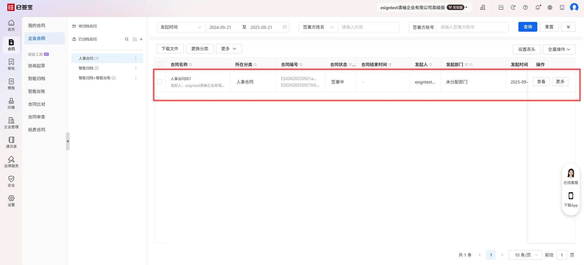 当企业文件较多,需要在e签宝SaaS官网-企业合同内新建很多类目文件夹去分别管理,手动分类整理比较耗费时间,希望文件在发起时就可以按照提前设置好的规则自动分类归档到对应的文件夹内,可以通过该功能实现。