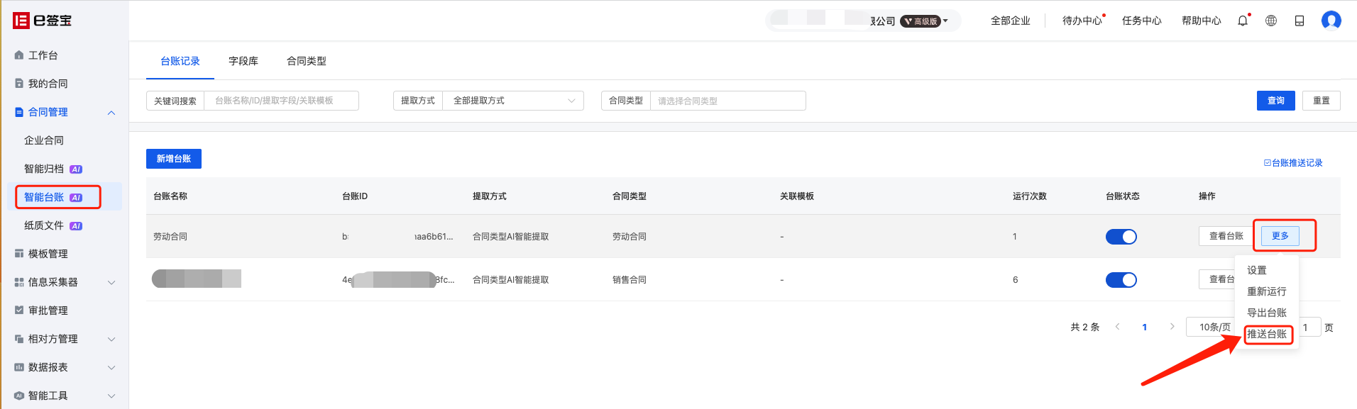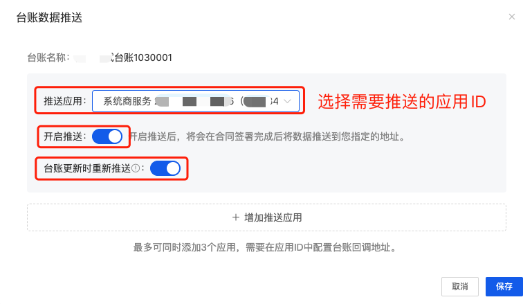【智能台账】进行台账配置页面(点击这里 了解智能台账如何配置)。台账设置后点击【推送台账】,选择需要推送的应用ID。