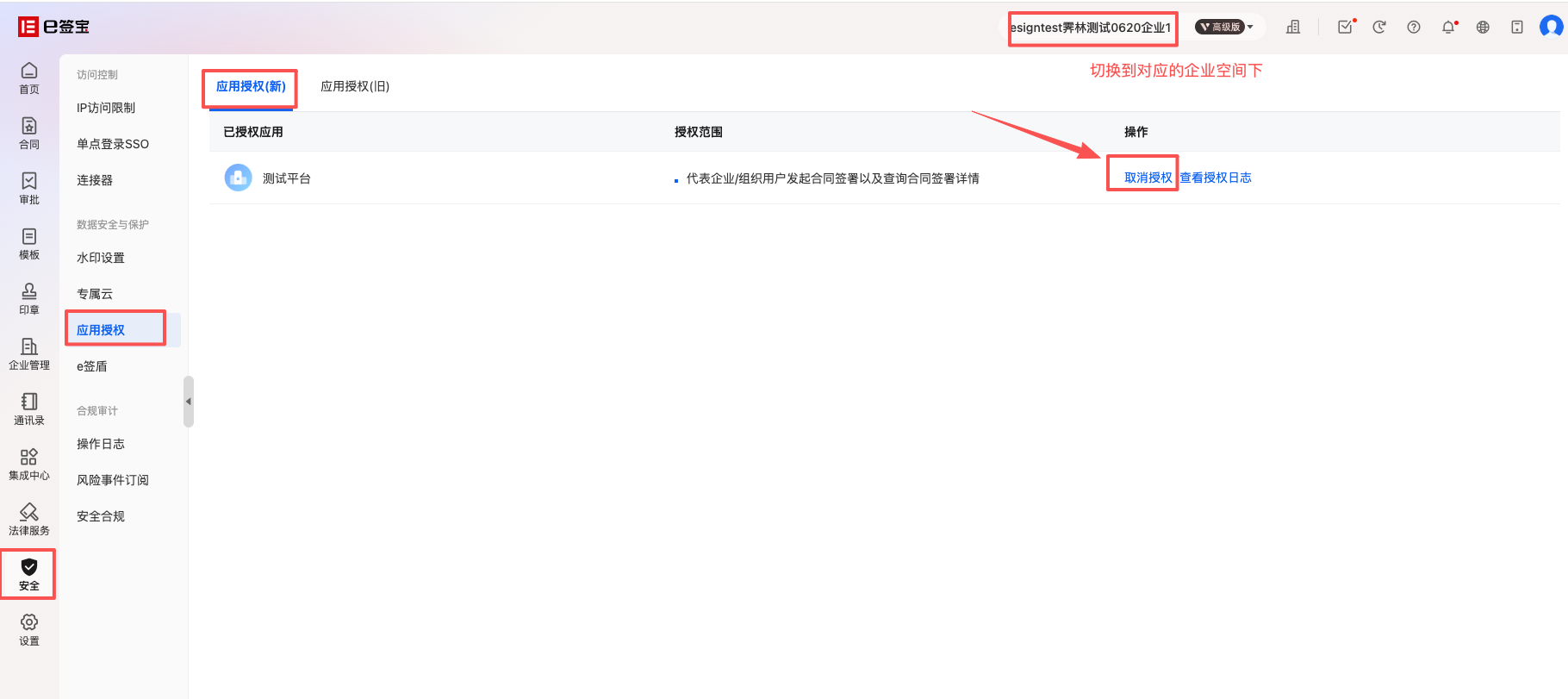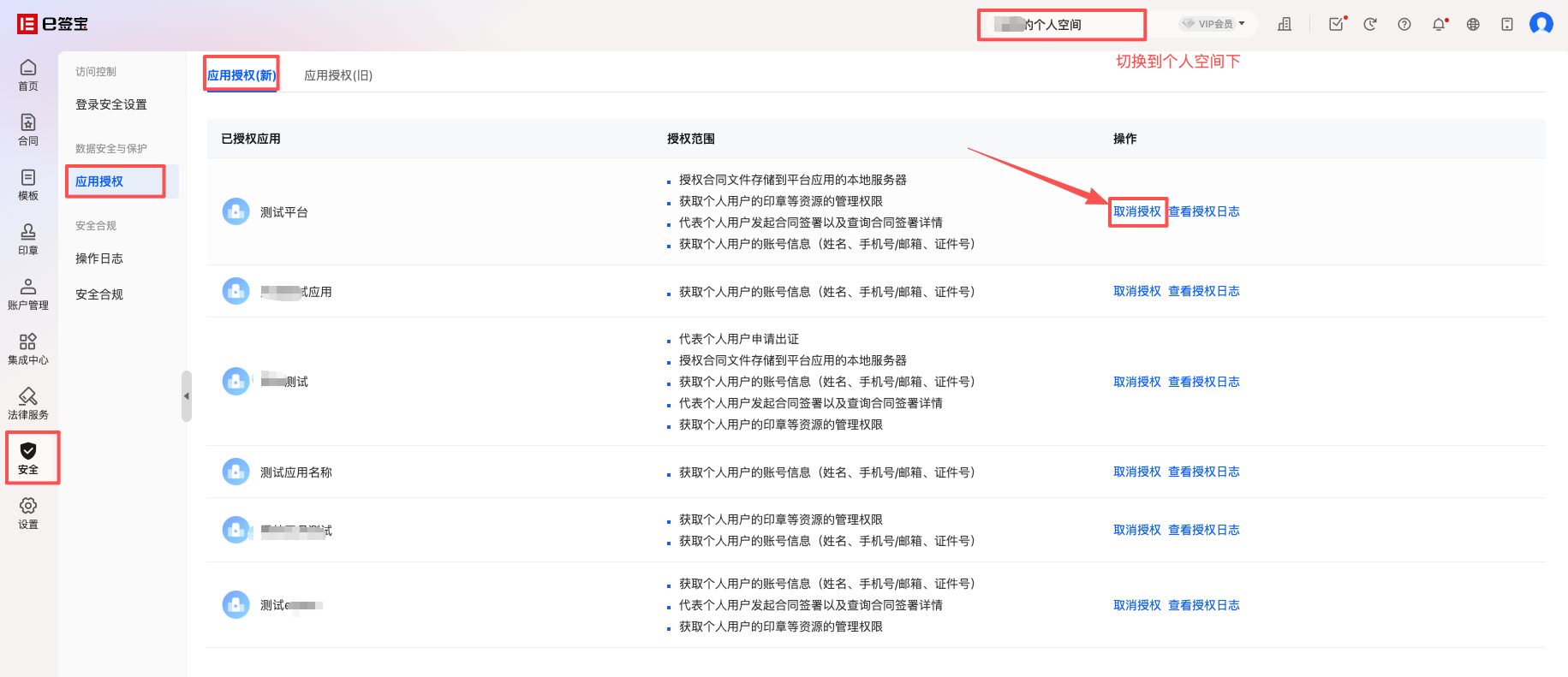 进入e签宝官网(模拟官网),左下角【安全】-【应用授权】-【应用授权(新)】-找到对应的授权平台点击【取消授权】