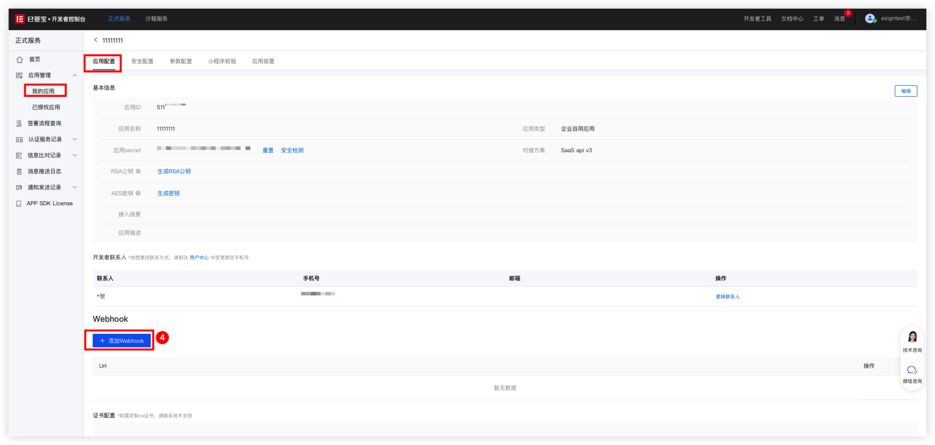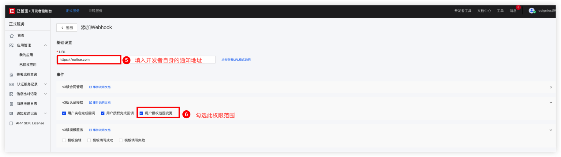 开发者登录e签宝 开放平台 后点击【控制台】进入e签宝开发者控制台,在页面上方先选择【正式服务】(沙箱环境则选择【沙箱服务】,其他流程一致),然后在页面下方左侧点击【应用管理】-【我的应用】后在右侧应用列表页面中点击【配置】进入“应用配置”页面,选择【添加Webhook】即可配置接收回调通知的URL,并需要在事件订阅中勾选:“用户授权范围变更”事件。如下图:
