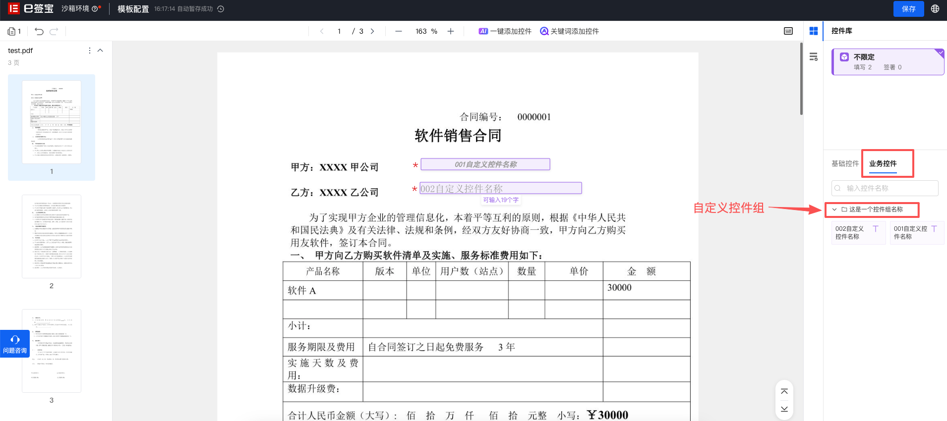 添加了自定义控件组的模板制作页面样式参考(使用【获取制作合同模板页面】接口制作模板):